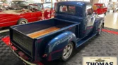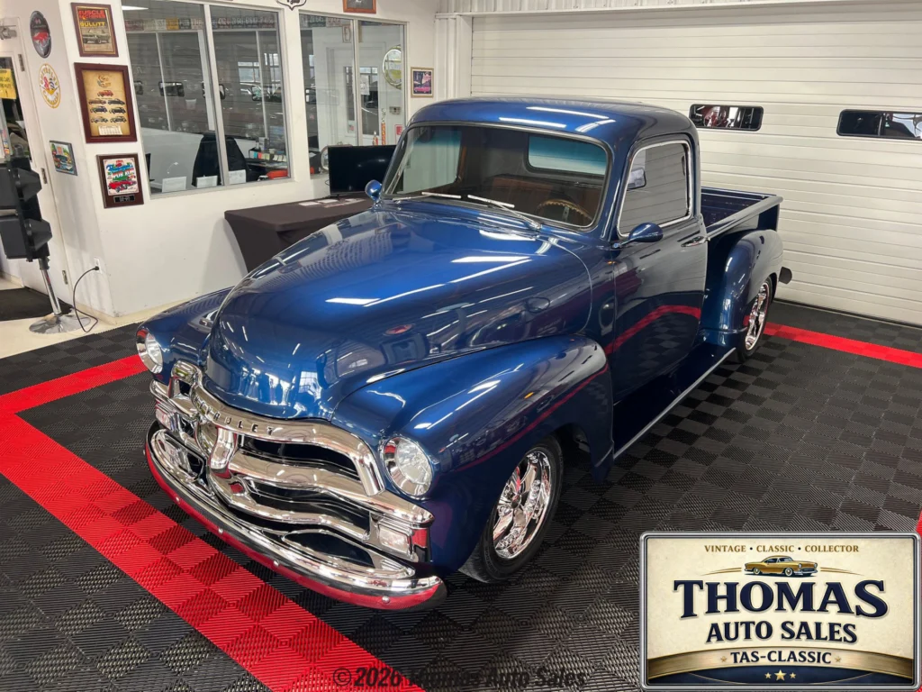This 1954 Chevrolet 3100 features a custom blue paint job, chrome “bullnose” grille, and smooth metal work with unique touches like frenched headlights and Cadillac tail-lights. The bed has glossy wood and screwless chrome rails, with a relocated gas tank. Powered by a 350ci V8 and TH350 automatic, it includes A/C, power steering, and chrome accents. Inside, the two-tone brown interior, wood grain details, and retro AM radio enhance the experience. Sitting on Foose wheels with Hancook tires, it’s a head-turner with tight body gaps and clean undercarriage.