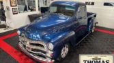 This 1954 Chevrolet 3100 features a custom blue paint job, chrome "bullnose" grille, and smooth metal work with unique touches like frenched headlights and Cadillac tail-lights. The bed has glossy wood and screwless chrome rails, with a relocated gas tank. Powered by a 350ci V8 and TH350 automatic, it includes A/C, power steering, and chrome accents. Inside, the two-tone brown interior, wood grain details, and retro AM radio enhance the experience. Sitting on Foose wheels with Hancook…