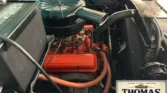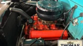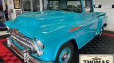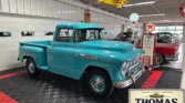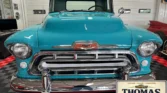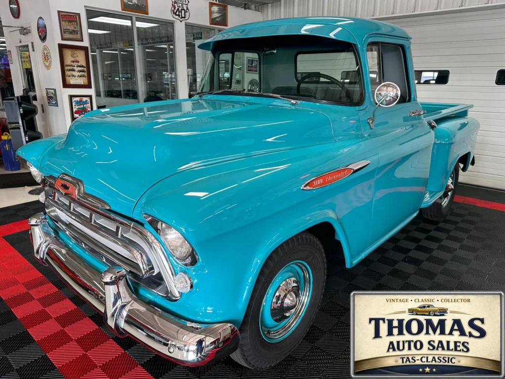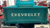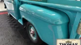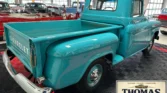 This 3100 shines in a striking Teal paint job with gleaming chrome accents. The standout features include a unique "Task Force Series" chrome grille, chrome hood emblem, and raised “spears” on the hood. The truck has a stepside bed with stained wood, chrome bumpers, and an orange oval “3100 Chevrolet” badge on the fenders. Powered by a 283ci V8 with a 3-speed manual transmission, it rides on body-color steel wheels with moon caps. Inside, the gray vinyl…