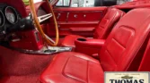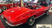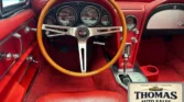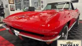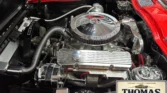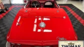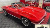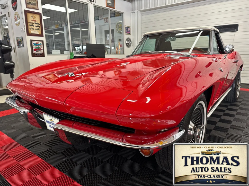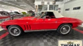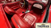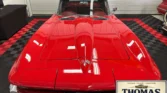 This 1965 Corvette shines in its original Rally Red paint with a crisp white convertible top. The paint is in good driver-quality condition with minor imperfections. It features pop-up headlights, a mirror-like front bumper, and a cross-flags badge. Bright accents like rocker moldings, door handles, and fender badges add to its appeal. The car also includes a red hardtop for a different look. At the rear, quad tail lights, a cross-flags gas cap, and chrome exhaust tips…