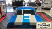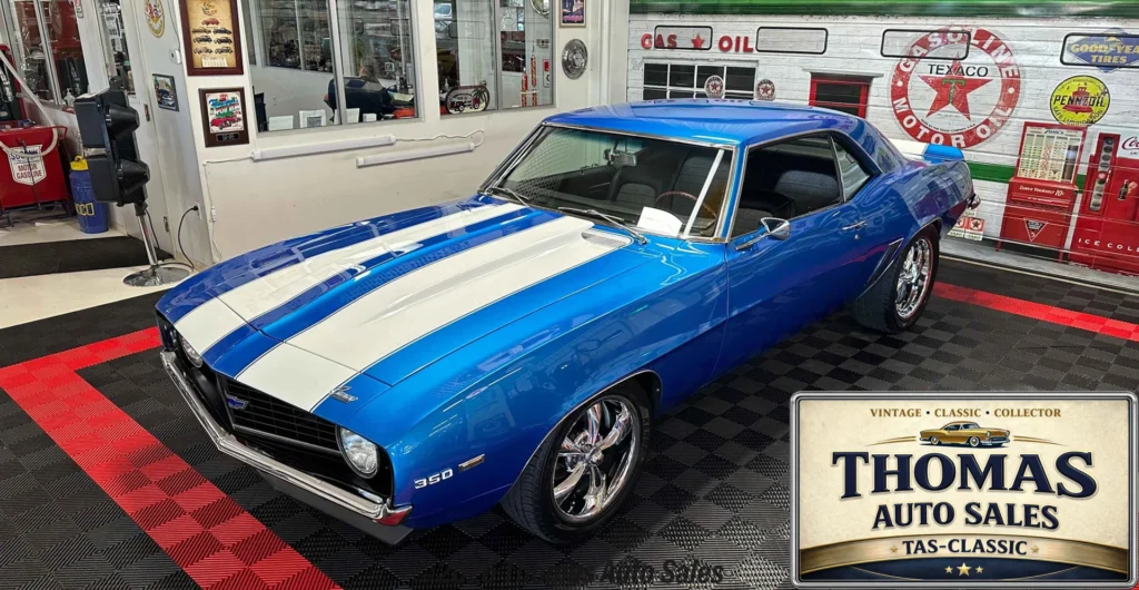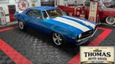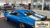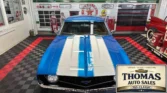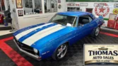 Stunning 1969 Camaro with a 350ci V8, 4-speed Muncie manual, and a striking bright blue paint job with white “Z” stripes. Features a lowered stance, chrome Ridler wheels, power front disc brakes, and a Houndstooth interior. Upgraded engine, exhaust, and cooling system.