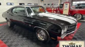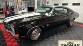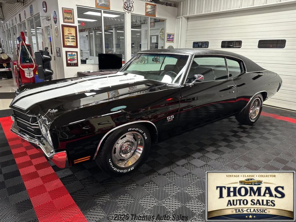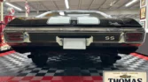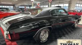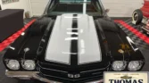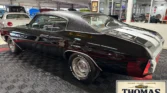 This 1970 Chevelle is a true icon of American muscle, now dressed in sleek black paint with white SS stripes, a black vinyl top, and matching black interior. The front features a working cowl induction hood, hood pins, a shiny bumper, quad headlights, and a black grille with white SS badging. Sitting on steel Rally wheels with BF Goodrich Radial TA tires, the car has an aggressive stance. Powered by a bright orange 454 V8 with an…