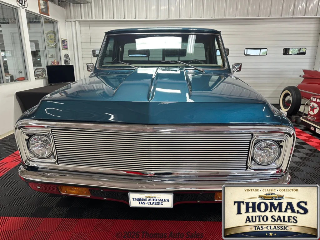 This stunning C-10 features high-quality aqua blue paint and gleaming chrome accents. The truck showcases a large rectangular grille, a cowl hood, and Custom 10 Deluxe badges. The wood bed floor, dual exhaust, and chrome Riddler wheels complete the exterior. Under the hood, a 6-liter LS V8 with Vintage A/C, headers, and power steering is paired with a 4L65 automatic transmission. Inside, the tan vinyl interior includes bucket seats, a custom console, and Dakota Digital gauges. Modern features like cold A/C, a Retro-sound stereo, and power brakes make this C-10 a must-have.